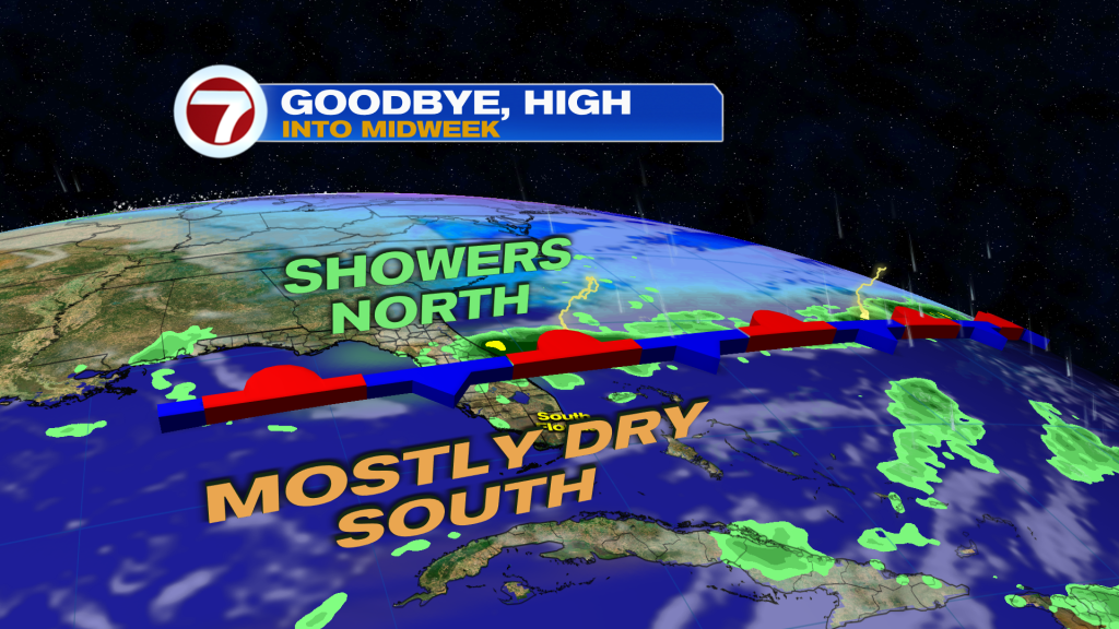 In the above graphic, you can see the (expected) stalling boundary across central areas of the state. That’s also where most moisture will be for potential showers, midweek. South Florida will largely miss the rain associated with this particular Front. However, a secondary Front is forecast to arrive into the weekend with better chances for rain.