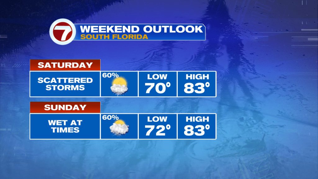 It’s shaping up to be a wet weekend across South Florida. Scattered showers and storms are expected both Saturday and Sunday as a stalled frontal boundary lingers over the region. The higher cloud cover and rain chances will keep highs in the lower 80s this weekend.