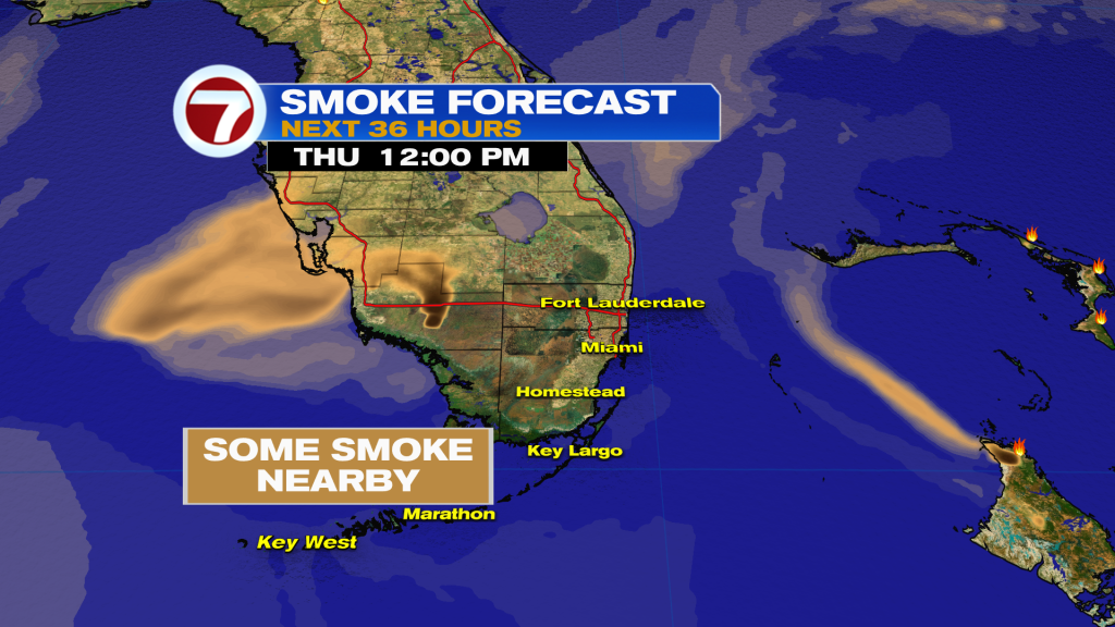 Aside from the smoke, temperatures are warming back up. After a comfortable start in the upper 50’s to low to mid 60’s, highs near 80 degrees for most of South Florida. A brief, light shower can’t be ruled out, mainly along the East coast, but most areas will be dry.