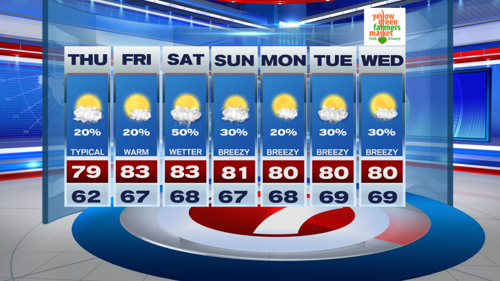 Heading into the weekend, rain chances climb a bit higher Saturday as a front stalls nearby. After that, temperatures stay warm with highs in the 80’s and a few spotty showers possible into early next week.