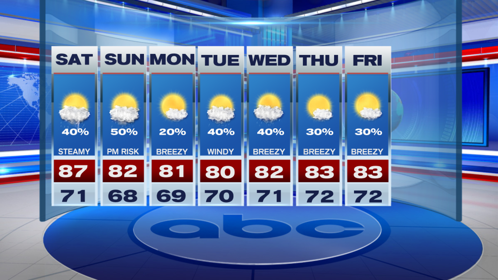 Looking ahead to next week, rain chances will stick around as a humid breeze off of the Atlantic sets up shop. It’s not drought busting rain but any drop of rain will help.
