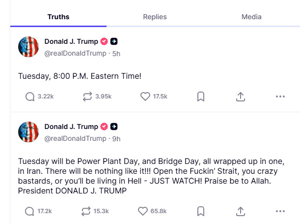 If Monday’s negotiations fail to produce a signed agreement or the reopening of the Strait, the President has designated Tuesday as “Power Plant Day” and “Bridge Day.”