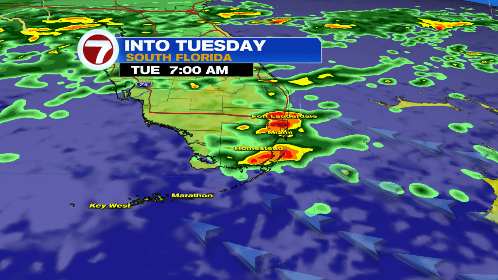 Forecast models show developing downpours. The latest guidance shows future impacts across Broward and Miami-Dade from the very start of the day, on Tuesday. Some of these rain bands will be sluggish to “move along”.